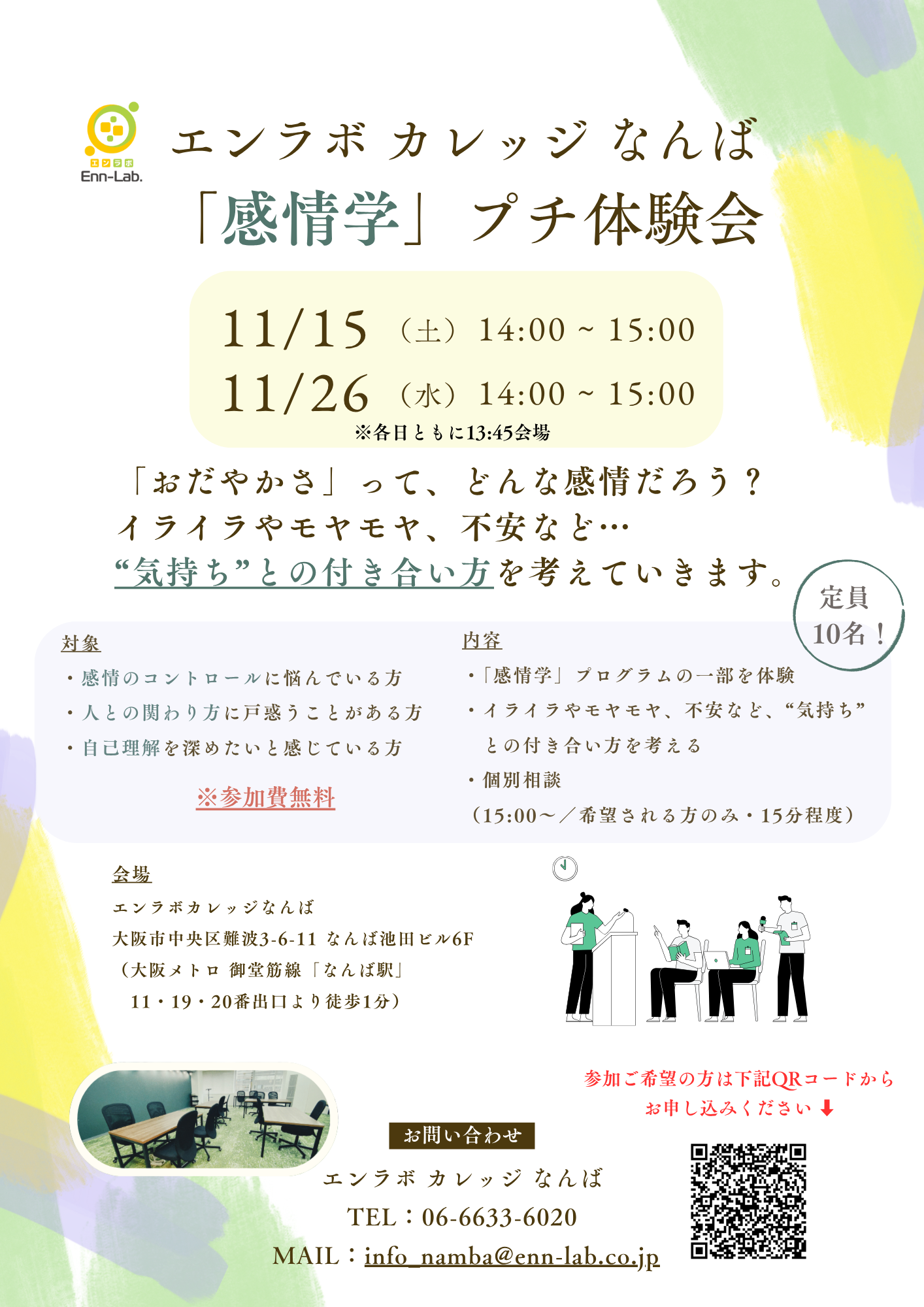 2025/11/04【なんば】「感情学」プチ体験会のお知らせ / 11月15日(土)・26日(水)Read More -